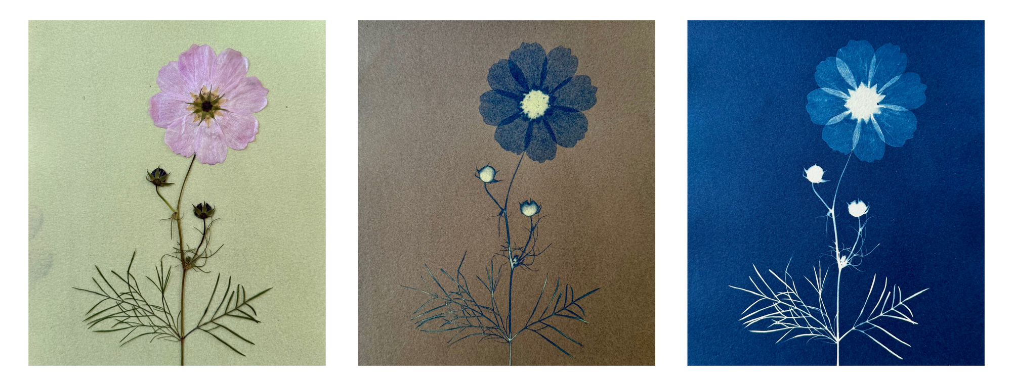 Cyanotype is a centuries-old photographic process that uses sunlight (or UV lights) and a UV-sensitive solution to create “blue prints” of images on paper or fabric. When sunlight hits paper that has been painted with the UV-sensitive solution, everything exposed to the UV light turns a deep Prussian blue after being rinsed in water, and anywhere that was blocked from the light turns white/light blue.